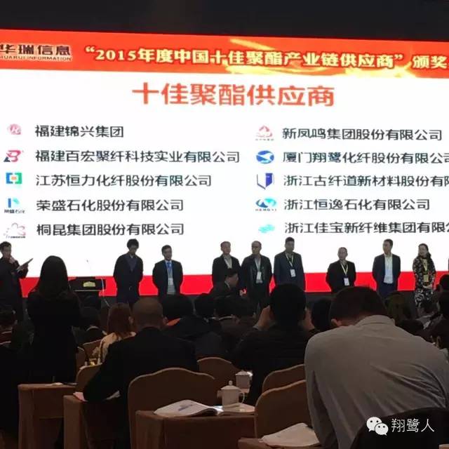 3月24日,聚酯行業(yè)“十佳”評選頒獎儀式在“第十五屆中國杭州化纖論壇”上舉行,廈門翔鷺化纖股份有限公司榮獲“2015十佳聚酯產(chǎn)業(yè)鏈供應商-十佳聚酯工廠”稱號,原料采購部尾川有康代表我司上臺領獎。